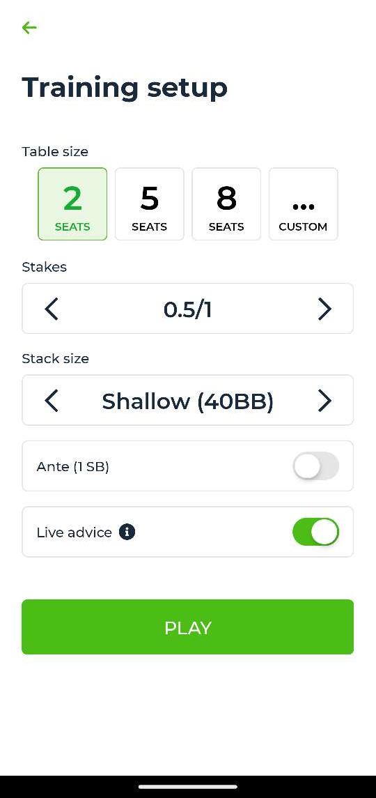 Aplikasi ini akan memungkinkan Anda bermain melawan PokerSnowie dalam berbagai konfigurasi: